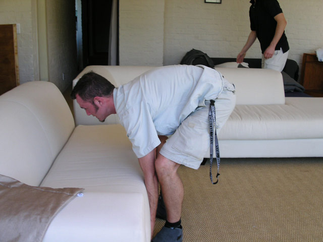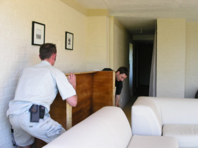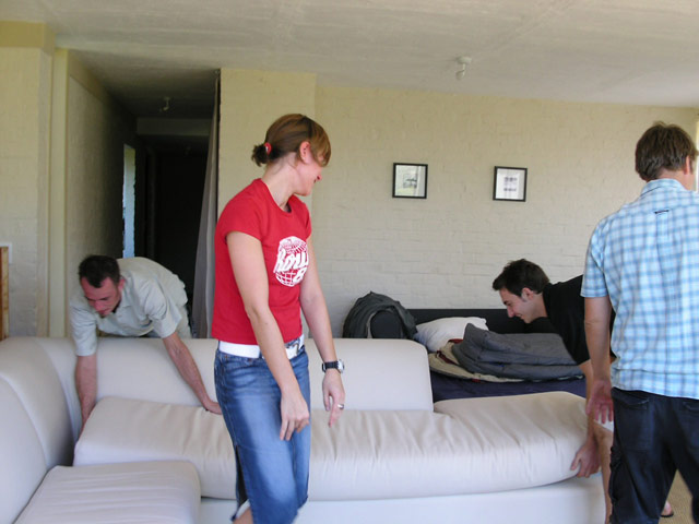 Gestärkt ging es dann ans Werk. Zunächst räumten wir das Wohnzimmer um. Da am Abend vorher noch zwei neue Personen (Claudia und Ulf aus Berlin) angekommen waren, fragte uns Klaus, ob wir etwas gegen "Untermieter" hätten. Selbstverständlich hatten wir nichts dagegen und so schleppten wir zunächst die grosse Couch aus dem Wohnzimmer aussen ums Haus in das Guesthouse.