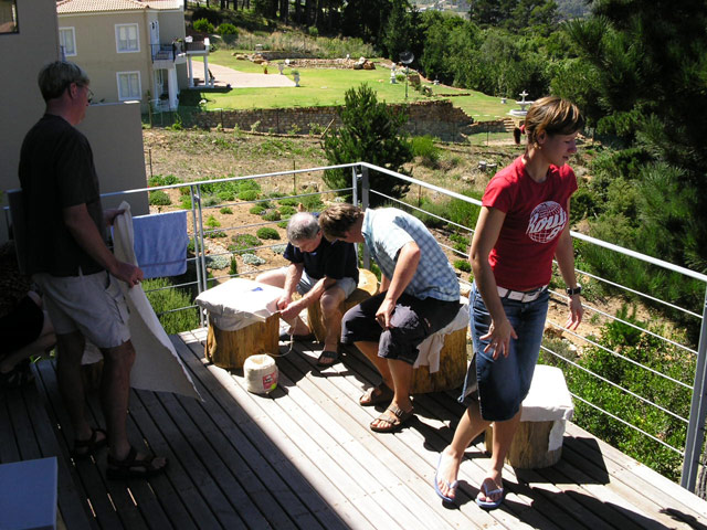 Wir standen alle recht früh auf und frühstückten erst einmal anständig. Wie jeden Morgen gab es wieder das Hammer-Mega-Lecker-Frisches-Obst-Frühstück und natürlich auch Brot, Brötchen etc. Wolfgang und Jost waren sogar noch vor dem Frühstück mit den Fahrrädern nach Hout Bay gefahren, um Joghurt für das Frühstück einzukaufen.