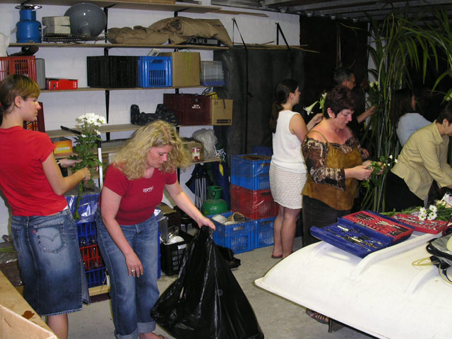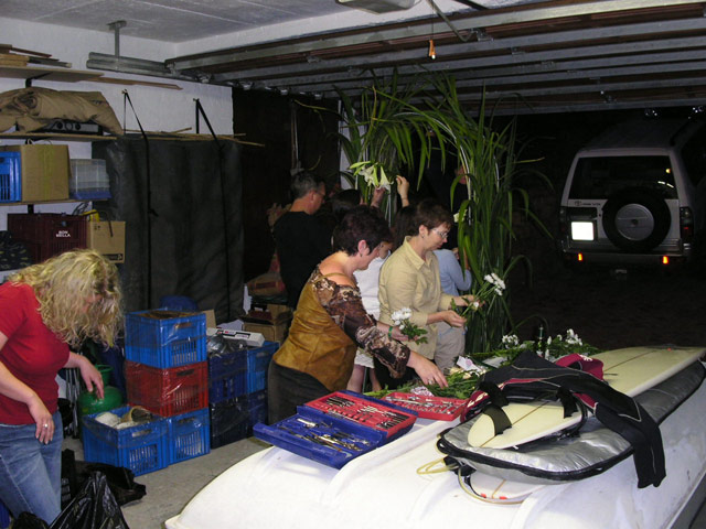 Als wir zurück zum Haus kamen, waren die anderen schon damit beschäftigt, den Blumenschmuck für die Hochzeit zu basteln. Neben wunderschönen Gestecken wurde der Torbogen mit Bambusblättern, weissen Blumen und weissen Schleifchen geschmückt, den wir am nächsten Tag mit zu dem Weingut nehmen wollten, wo die Hochzeitsfeierlichkeit stattfinden sollte.