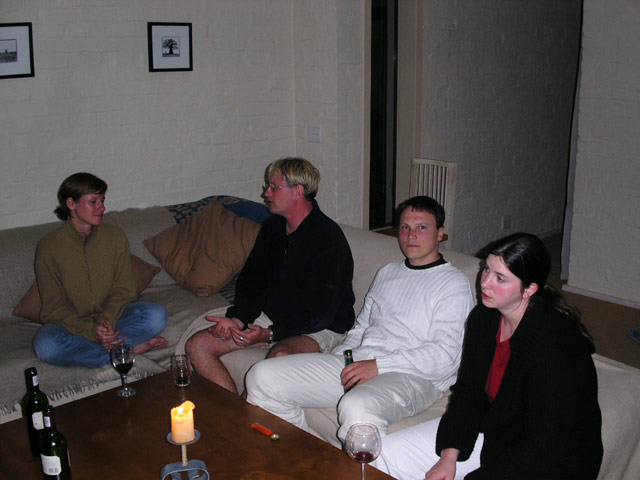 Nachdem wir mit Essen, Schmücken, Aufräumen und Spülen fertig waren, setzen wir uns oben aufs Deck und liessen den Abend bei Bier und Wein ausklingen/eskalieren. Sandra und Klaus gingen heute relativ früh ins Bett, um für die Hochzeit am nächsten Tag fit zu sein. Damit die beiden endlich mal ihren wohlverdienten Schlaf bekommen konnten, verlagerten wir mit dem Rest der Leute (Rudi, Michael, Claudia, Ulf, Tanja, Alex, Jost, Stefan, Sandra B. und ich) nach unten zu uns ins Guesthouse, wo wir noch bis ca. 03:00 Uhr sassen und plauderten. Gegen 02:30 Uhr stand dann auf einmal wieder Klaus, völlig verpennt und im weissen Bademantel, bei uns im Zimmer und trank ein letztes Glas Rotwein mit uns. Er war durch die ungewohnte Stille im Haus wach geworden und hatte Angst, dass wir uns heimlich die üblichen miesen Spielchen für die Hochzeit ausdenken würden... haben wir aber nicht... EHRLICH NICHT! (;