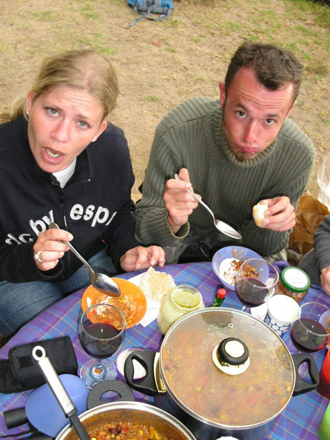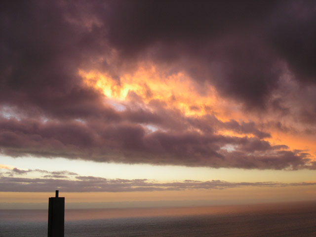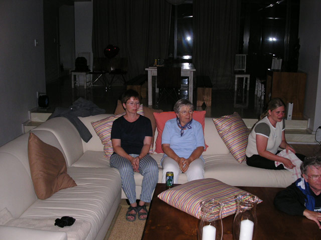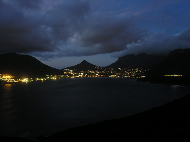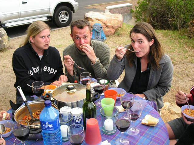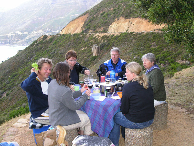 Auf unserem Rückweg nach Hause hielten wir in der Constantia Mall, um die Zutaten für das heutige Abendessen einzukaufen. Brownie und ich hatten uns für den heutigen Küchendienst eingeteilt, es sollte Chili geben. Während wir noch auf der Rückfahrt waren, kam mir die Erinnerung an meinen letzten Aufenthalt hier. Damals hatten wir mit einem Topf Linsensuppe bewaffnet, den Sonnenuntergang am Chapman's Peak Drive genossen. Einstimmig wurde unser Vorschlag, dieses Event heute zu wiederholen, angenommen. Schnell wurde das Futter vorbereitet und der Cooler gepackt, da die Sonne schon im Begriff war, unterzugehen. Mit beiden Autos fuhren wir zu einer der Haltebuchten auf dem Chapman's Peak Drive und setzen uns an einen der überall zu findenen (festinstallierten) Picknick-Tische. Bei gutem Wein und lecker Futter genossen alle die traumhafte Aussicht. Leider war es heute ein wenig wolkig, so daß wir den letztendlichen Sonnenuntergang nicht ganz sehen konnten. Dennoch war der Anblick einmal mehr unvergesslich.