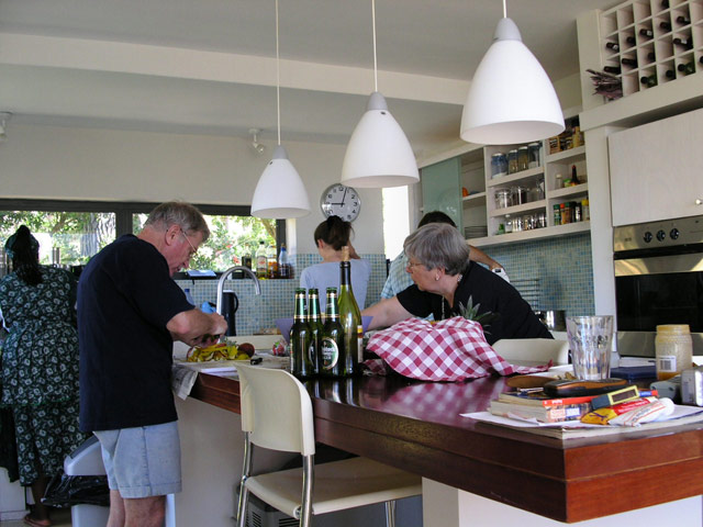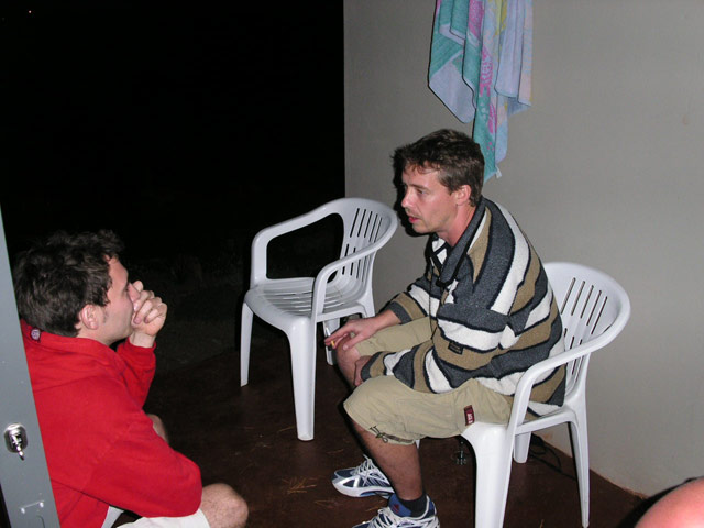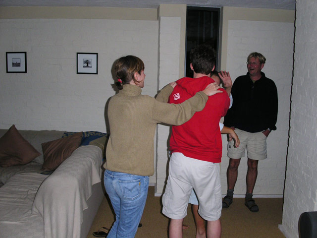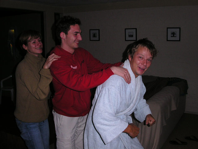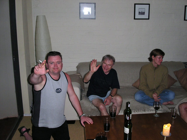 Nachdem wir mit Essen, Schmücken, Aufräumen und Spülen fertig waren, setzen wir uns oben aufs Deck und liessen den Abend bei Bier und Wein ausklingen/eskalieren. Sandra und Klaus gingen heute relativ früh ins Bett, um für die Hochzeit am nächsten Tag fit zu sein. Damit die beiden endlich mal ihren wohlverdienten Schlaf bekommen konnten, verlagerten wir mit dem Rest der Leute (Rudi, Michael, Claudia, Ulf, Tanja, Alex, Jost, Stefan, Sandra B. und ich) nach unten zu uns ins Guesthouse, wo wir noch bis ca. 03:00 Uhr sassen und plauderten. Gegen 02:30 Uhr stand dann auf einmal wieder Klaus, völlig verpennt und im weissen Bademantel, bei uns im Zimmer und trank ein letztes Glas Rotwein mit uns. Er war durch die ungewohnte Stille im Haus wach geworden und hatte Angst, dass wir uns heimlich die üblichen miesen Spielchen für die Hochzeit ausdenken würden... haben wir aber nicht... EHRLICH NICHT! (;