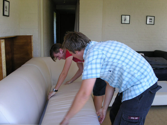 Gestärkt ging es dann ans Werk. Zunächst räumten wir das Wohnzimmer um. Da am Abend vorher noch zwei neue Personen (Claudia und Ulf aus Berlin) angekommen waren, fragte uns Klaus, ob wir etwas gegen "Untermieter" hätten. Selbstverständlich hatten wir nichts dagegen und so schleppten wir zunächst die grosse Couch aus dem Wohnzimmer aussen ums Haus in das Guesthouse.
