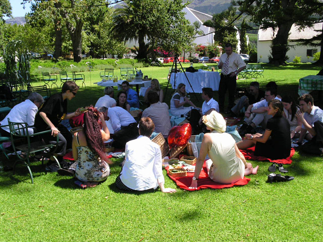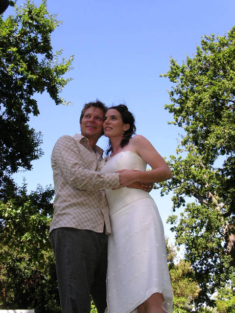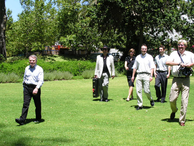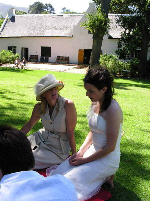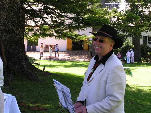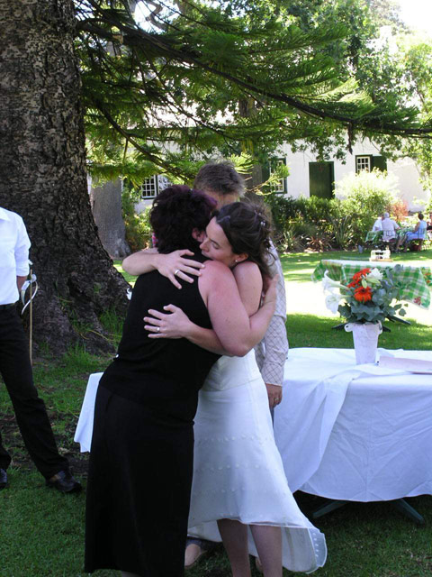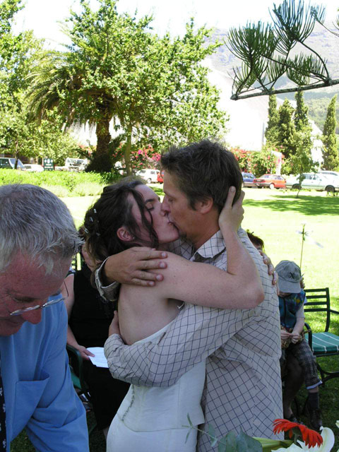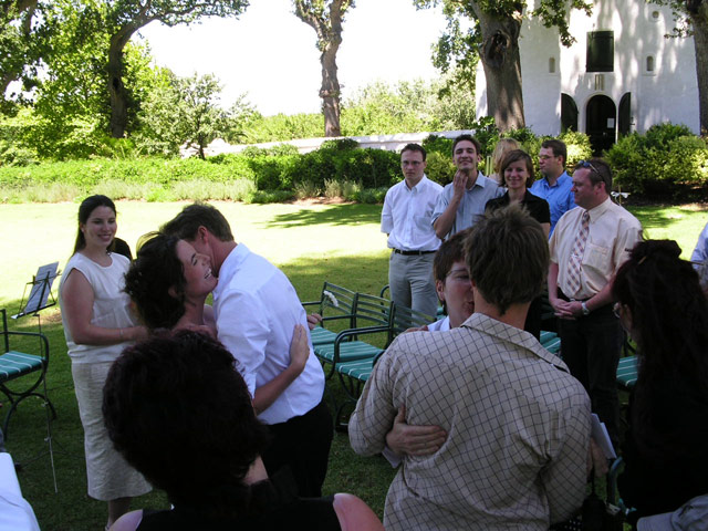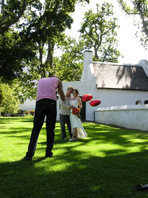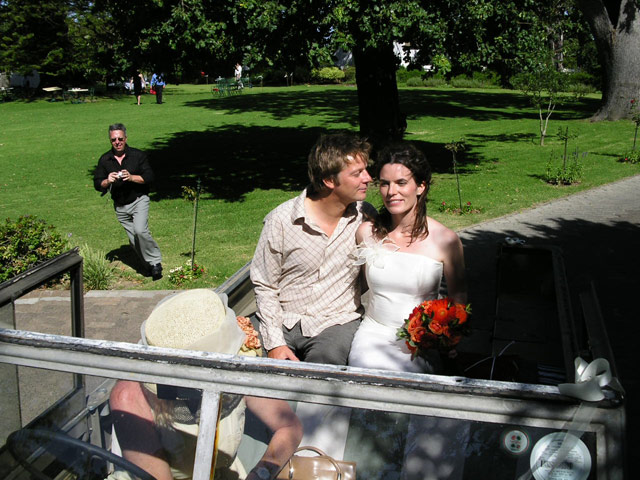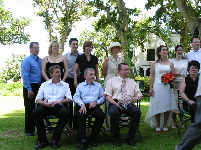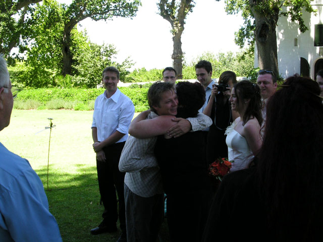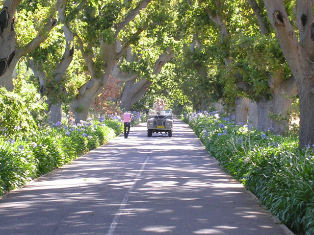 Danach gings es nochmals nach Capetown zum Liquor-Store, um die Weinreserven aufzufüllen, die dem Vorabend zum Opfer gefallen waren (Sorry Klausi (;). Wolfgang und ich sprangen kurz bei Giovanni's rein und kauften ein paar masslos leckere italienische Sandwiches, anschliessend ging es dann wieder zurück nach Hause. Dort packten wir noch ein paar Sachen, die wir für die Hochzeit brauchten und fuhren mit Marc, Carlo, Klaus und mir zum Weingut. Dort trafen wir die letzten Vorbereitungen und machten noch ein paar Kamera-Tests. Gegen 12:00 Uhr trudelten alle restlichen Gäste ein und brachten sich in Position, um die Braut gebührend in Empfang zu nehmen. Um ca. 13:00 Uhr fuhr Yvonne mit ihrem Landrover die Braut mit stolzer Mutter und Tanja, der Trauzeugin vor.
