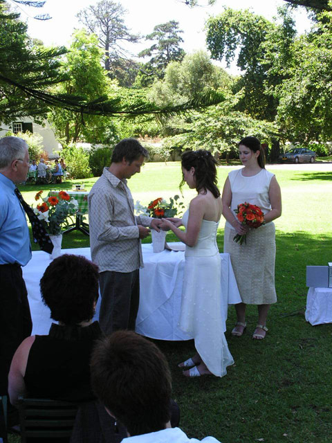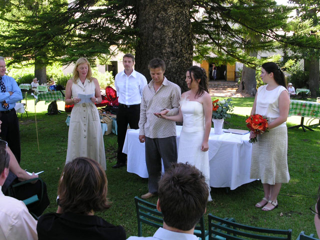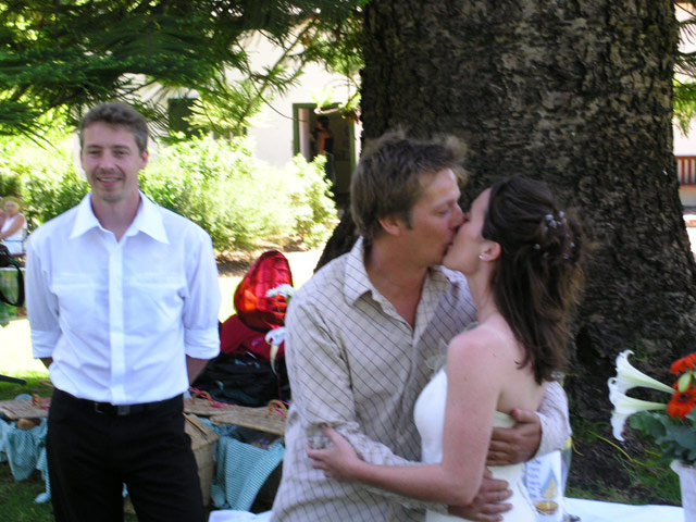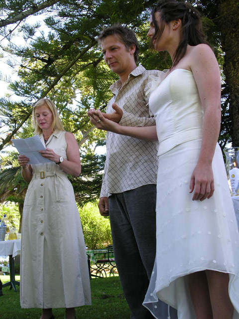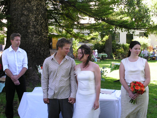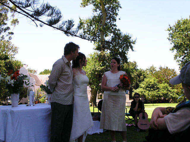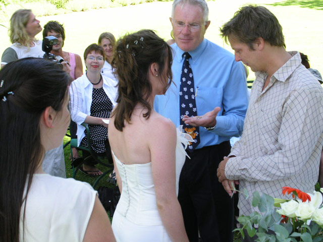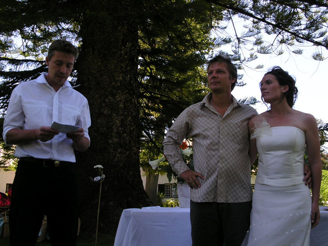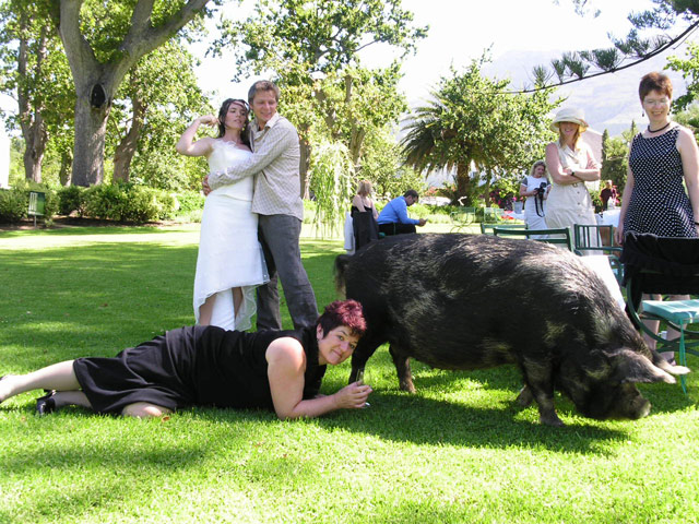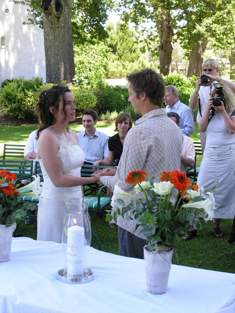 Feierlich schritt Sandra (H., noch nicht ganz T.) den Kiesweg am Arm ihrer Mutter entlang. Am "Altar" übergab Doris ihre Tochter an Klaus und der (supernette) Pastor begann mit der Trauungszeremonie. Nach ein paar einleitenden Worten des Pastors trat Yvonne vor die Gäste und las das Gedicht "The hands of bride and groom" vor. Mitten in Yvonne's Vortrag erklangen auf einmal seltsame Grunzlaute und noch ehe wir richtig verstanden hatten, was hier gerade los war, sahen wir, dass ein riesiges schmatzendes Schwein mitten durch unsere Hochzeitsgesellschaft wanderte. Aber da wir ja wissen, dass Schweine Glück bringen, waren alle sehr angenehm amüsiert. Yvonne brachte ihr Gedicht nach der kurzen erheiternden Pause zu Ende, worauf der Pastor den zweiten Teil der Zeremonie einleitete. Daraufhin spielte Carlo ein Stück auf der Gitarre.