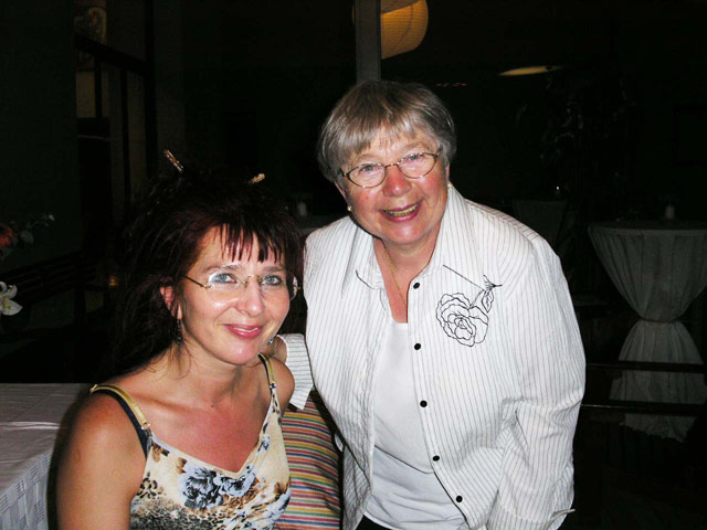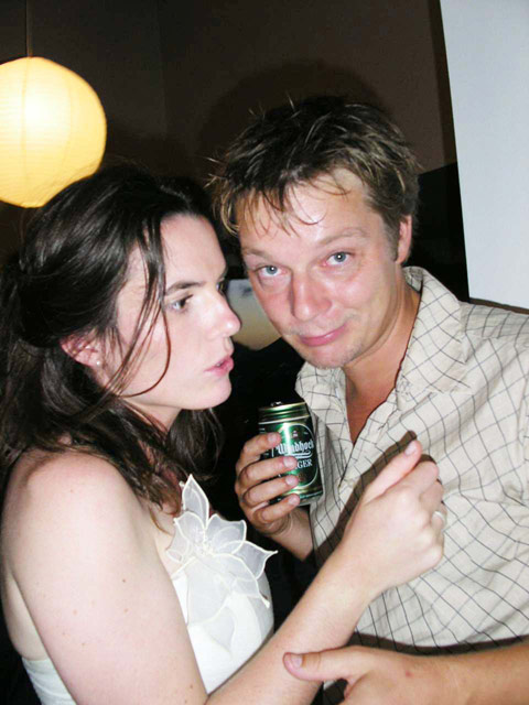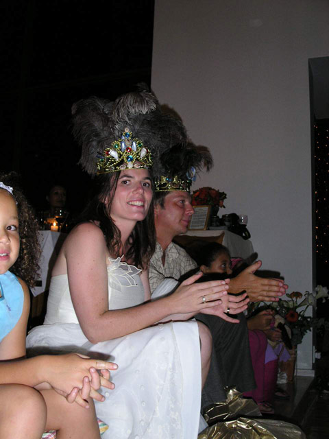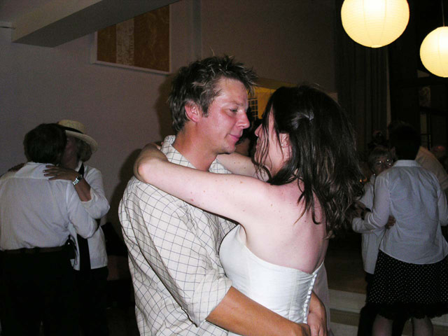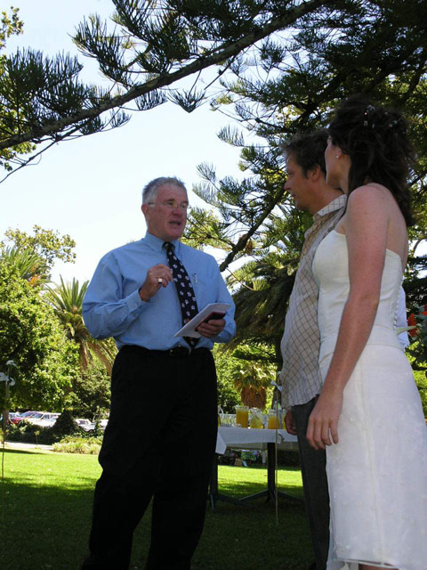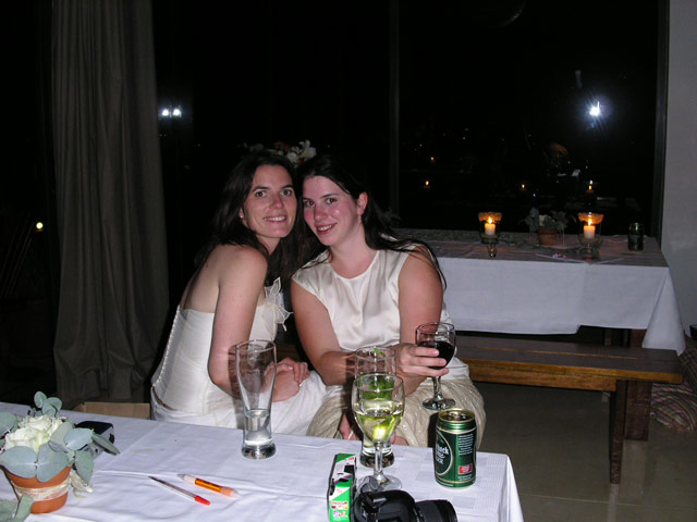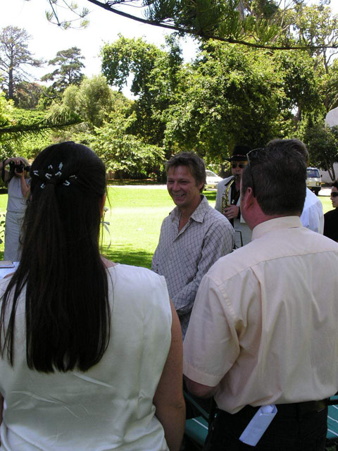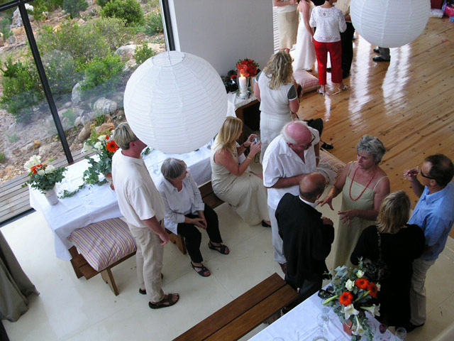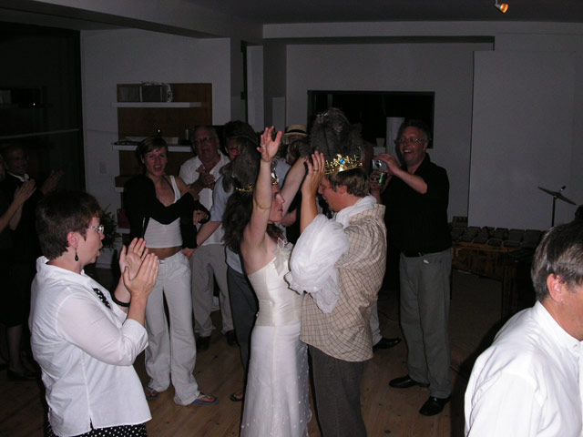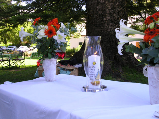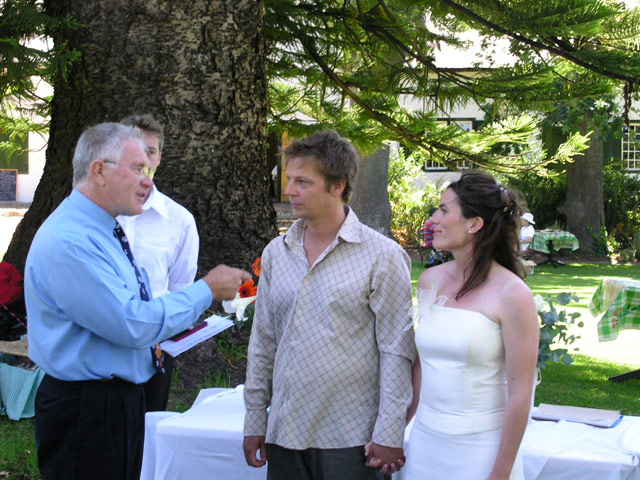 Feierlich schritt Sandra (H., noch nicht ganz T.) den Kiesweg am Arm ihrer Mutter entlang. Am "Altar" übergab Doris ihre Tochter an Klaus und der (supernette) Pastor begann mit der Trauungszeremonie. Nach ein paar einleitenden Worten des Pastors trat Yvonne vor die Gäste und las das Gedicht "The hands of bride and groom" vor. Mitten in Yvonne's Vortrag erklangen auf einmal seltsame Grunzlaute und noch ehe wir richtig verstanden hatten, was hier gerade los war, sahen wir, dass ein riesiges schmatzendes Schwein mitten durch unsere Hochzeitsgesellschaft wanderte. Aber da wir ja wissen, dass Schweine Glück bringen, waren alle sehr angenehm amüsiert. Yvonne brachte ihr Gedicht nach der kurzen erheiternden Pause zu Ende, worauf der Pastor den zweiten Teil der Zeremonie einleitete. Daraufhin spielte Carlo ein Stück auf der Gitarre.