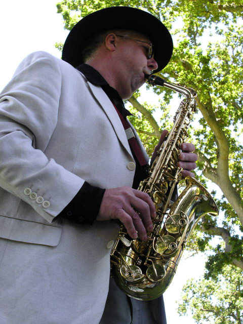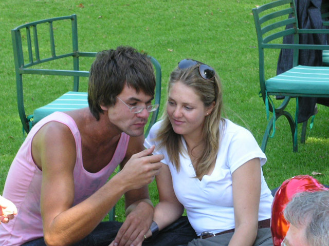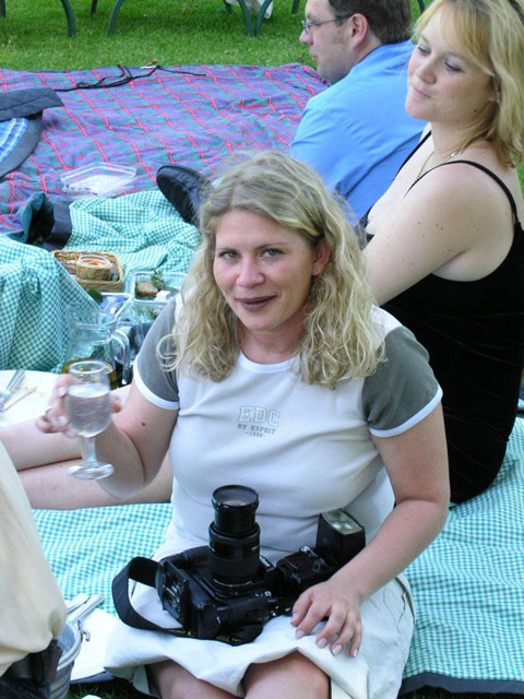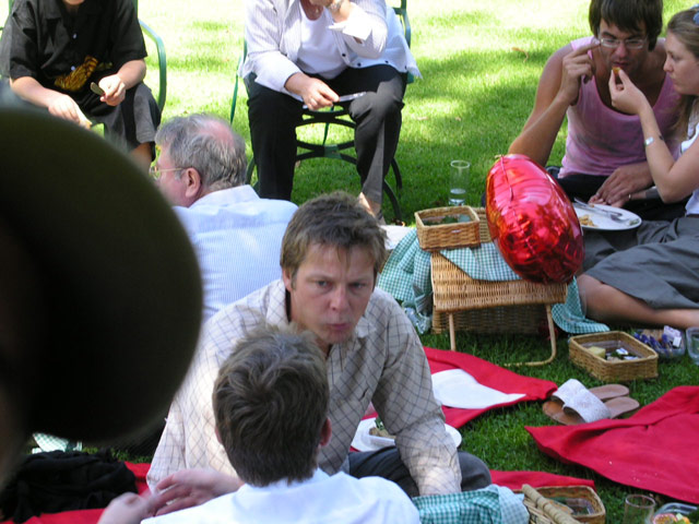 Anschliessend gaben sich beide ihr Eheversprechen, was bei allen Anwesenden die Tränchen in die Augen trieb... neeeeee, wie romantisch. Zu guter Letzt rundete Wolfgang die Zeremonie mit seinem Saxophon-Vortrag an. Was war das schön! Nach dem klassischen Teil mit den Ringen kam das große Knuutschen und Beglückwünschen. Daraufhin gab es an Stelle von Kaffee und Kuchen mal etwas ganz anderes (wie Sandra (jetzt endlich T.) und Klaus nunmal sind...), nämlich ein wunderschönes Picknick auf der Wiese, wo vorher auch die Trauung stattgefunden hatte. Wir sassen, assen und tranken, während Marc und Sandra B. parallel die Hochzeitsfotos mit Sandra und Klaus schossen. Immer wieder gesellte sich die dicke Sau zu uns, was zur allgemeinen Erheiterung beitrug.