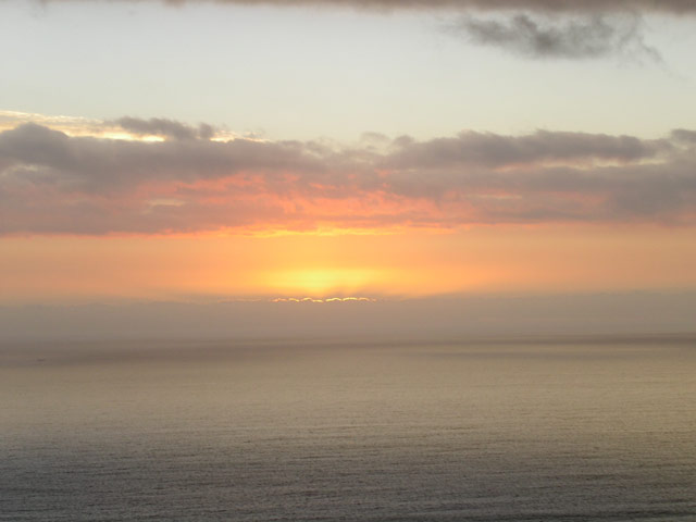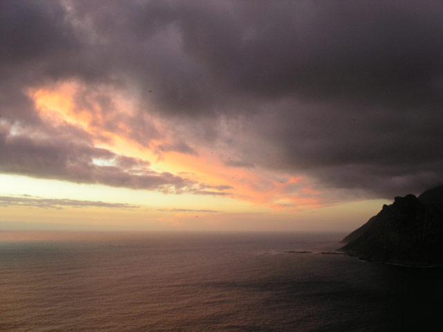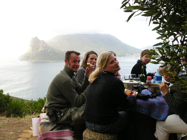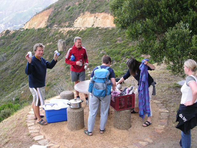Auf unserem Rückweg nach Hause hielten wir in der Constantia Mall, um die Zutaten für das heutige Abendessen einzukaufen. Brownie und ich hatten uns für den heutigen Küchendienst eingeteilt, es sollte Chili geben. Während wir noch auf der Rückfahrt waren, kam mir die Erinnerung an meinen letzten Aufenthalt hier. Damals hatten wir mit einem Topf Linsensuppe bewaffnet, den Sonnenuntergang am Chapman's Peak Drive genossen. Einstimmig wurde unser Vorschlag, dieses Event heute zu wiederholen, angenommen. Schnell wurde das Futter vorbereitet und der Cooler gepackt, da die Sonne schon im Begriff war, unterzugehen. Mit beiden Autos fuhren wir zu einer der Haltebuchten auf dem Chapman's Peak Drive und setzen uns an einen der überall zu findenen (festinstallierten) Picknick-Tische. Bei gutem Wein und lecker Futter genossen alle die traumhafte Aussicht. Leider war es heute ein wenig wolkig, so daß wir den letztendlichen Sonnenuntergang nicht ganz sehen konnten. Dennoch war der Anblick einmal mehr unvergesslich.