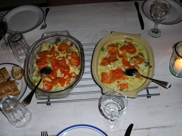 Zu Hause angekommen, trafen wir die anderen gerade bei der Zubereitung des Abendessens an. Heute gab es Auflauf, einmal vegetarisch, einmal mit Speck, zubereitet von Edith. Wir genossen das Futter und erneut ein paar Fläschchen Roten und gingen auch diesen Abend müde aber zufrieden in die Heia.